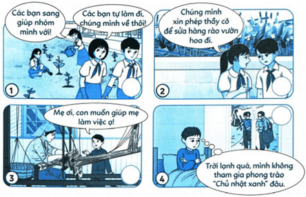 Tình huống 1: Đang phụ mẹ tưới cây ngoài sân, Hoàng thấy một cô lao công mồ hôi nhễ nhại đi tới và ngồi nghỉ trước cổng nhà mình. Hoàng liền xin phép mẹ đi lấy nước cho cô uống. Mẹ Hoàng rất vui vì thấy con mình biết quý trọng người lao động.