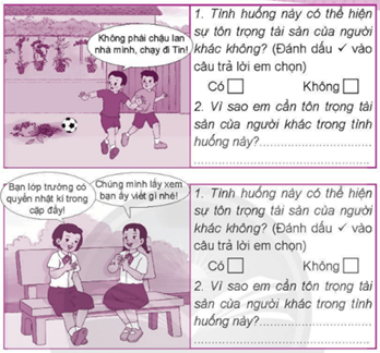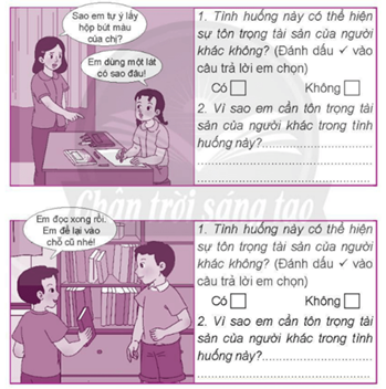 Đánh dấu x vào ô chỉ tình huống thể hiện sự tôn trọng tài sản của người khác và nêu biểu hiện của sự tôn trọng đó.