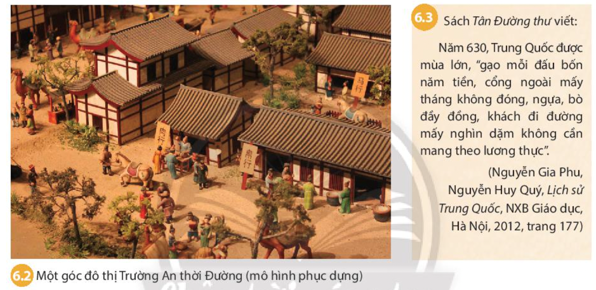 Quán sát hình 6.2 và đọc tư liệu 6.3 có thể thấy: khung cảnh đường phố nhộn nhịp, sự phồn thịnh thể hiện ở việc nơi đâu cũng có lương thực “khách đi đường mấy nghìn dặm không cần mang theo lương thực”.