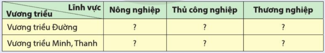 Hãy lập bảng theo mẫu dưới đây và điền nội dung về tình hình kinh tế của Trung Quốc thời Đường và Minh, Thanh.
