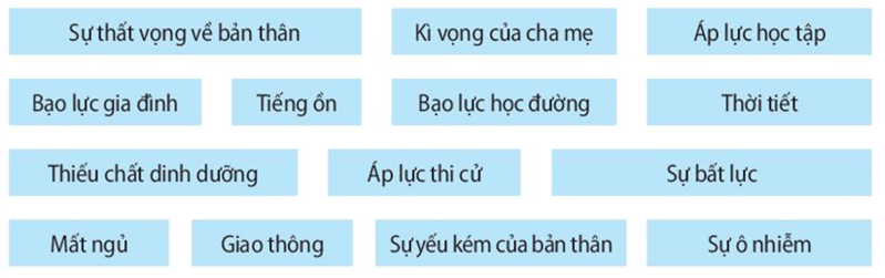- Kì vọng của cha mẹ - Áp lực học tập - Bạo lực gia đình - Tiếng ồn - Bạo lực học đường - Thời tiết - Áp lực thi cử - Giao thông - Sự ô nhiễm |