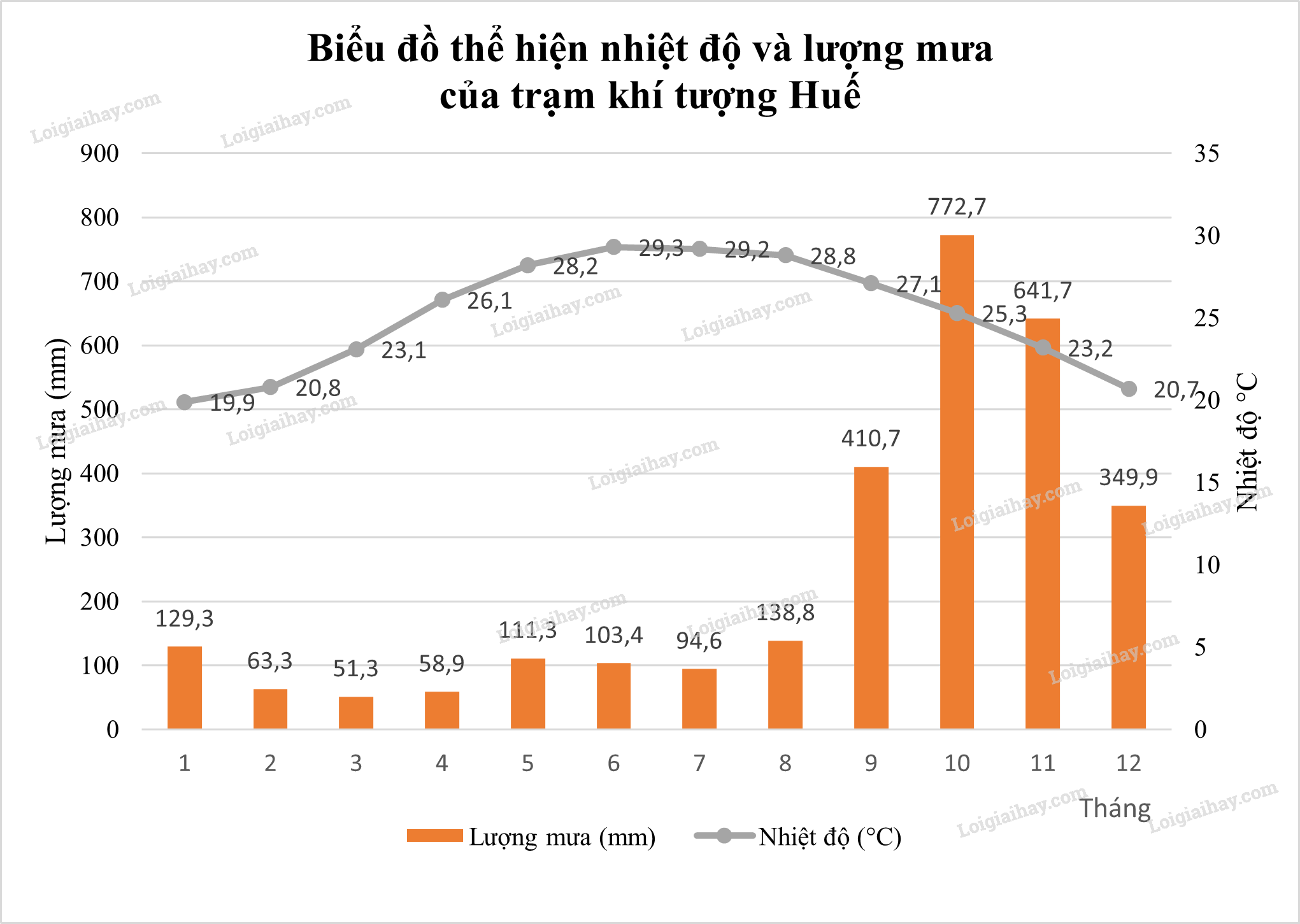 - Cột thể hiện lượng mưa, đường thể hiện nhiệt độ.