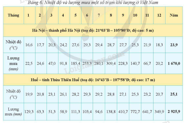 + Nhiệt độ tháng cao nhất và nhiệt độ tháng thấp nhất (xác định qua số liệu trong bảng: tháng cao nhất và tháng thấp nhất)