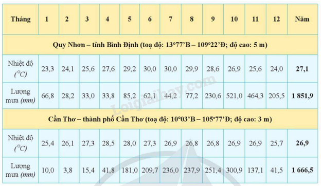 + Lượng mưa tháng cao nhất và lượng mưa tháng thấp nhất (xác định qua số liệu trong bảng: tháng cao nhất và tháng thấp nhất)