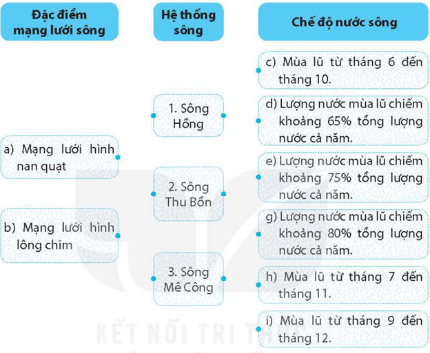 Ghép các ô bên trái và bên phải với ô ở giữa cho phù hợp về đặc điểm mạng lưới sông và chế độ nước ở ba hệ thống sông lớn.