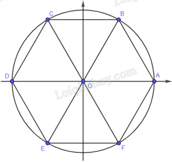 Cho lục giác đều \(ABCDEF\)nội tiếp trong đường tròn lượng giác (thứ tự đi từ \(A\) đến các đỉnh theo chiều ngược chiều kim đồng hồ). Tính số đo của các góc lượng giác \(\left( {OA,OB} \right)\), \(\left( {OA,OC} \right)\), \(\left( {OA,OD} \right)\), \(\left( {OA,OE} \right)\), \(\left( {OA,OF} \right)\).