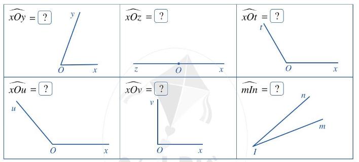 Đo các góc sau đây và cho biết số đo của chúng. Xác định góc nhọn, góc vuông góc tù, góc bẹt trong các góc đó.