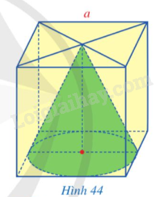 Hình 44 mô tả cách người ta cắt bỏ đi từ một khối gỗ có dạng hình lập phương cạnh a để được một khối gỗ có dạng hình nón. Tính thể tích của phần gỗ bị cắt bỏ đi theo a.