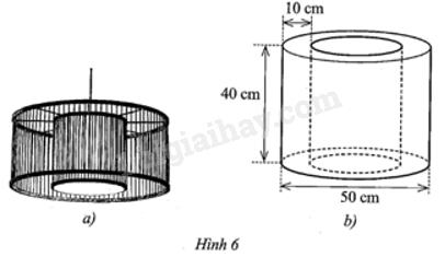 Một chiếc đèn khung tre đan trang trí phòng khách có dạng hai hình trụ với cùng chiều cao được lồng vào nhau (Hình 6a). Mặt xung quanh của hình trụ bên trong được dán bằng vải màu mỡ gà, mặt xung quanh của hình trụ bên ngoài được dán bằng vải màu tím. Các kích thước của hai hình trụ đó được mô tả như ở Hình 6b.