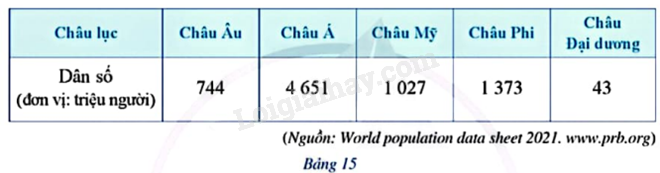 Bảng 15 thống kê dân số thế giới (đơn vị: triệu người) phân theo các châu lục tính đến tháng 7/2021: