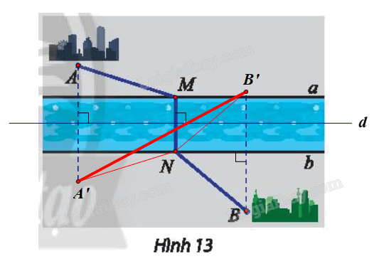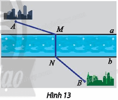 Hai thành phố A, B nằm ở hai bên bờ của một con sông (Hình 13). Giả sử hai bờ sông là hai đường thẳng song song a, b. Tìm vị trí điểm M bên bờ a và N bên bờ b để xây dựng một chiếc cầu MN sao cho MN vuông góc với a, b và tổng khoảng cách AM + NB ngắn nhất.