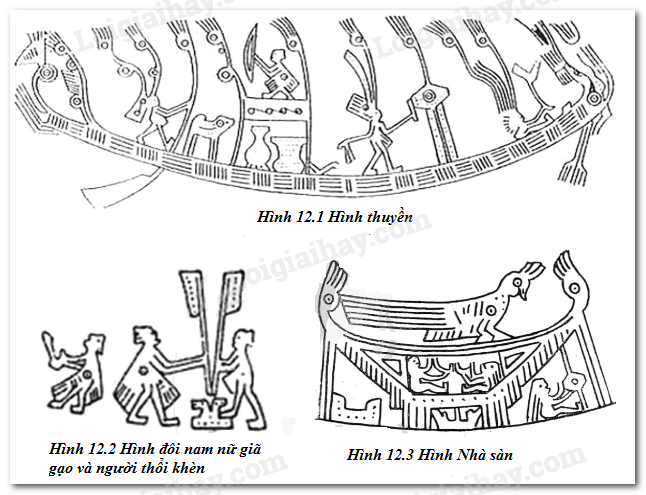 - Hình đôi nam nữ giã gạo và thổi khèn thể hiện đời sống vật chất và tinh thần của người dân Văn Lang. Giã gạo để phục vụ cuộc sống, nhưng giã gạo cũng được coi là một trò chơi trong các lễ hội.