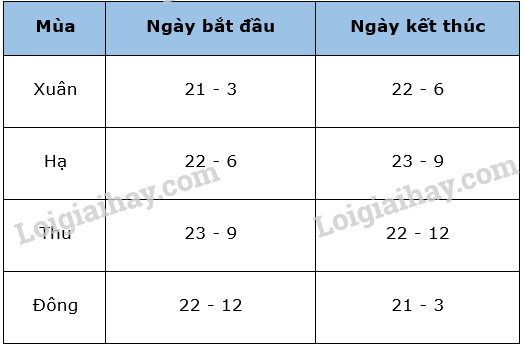 Vận dụng kiến thức đã học về các mùa trên Trái Đất để hoàn thành bảng.