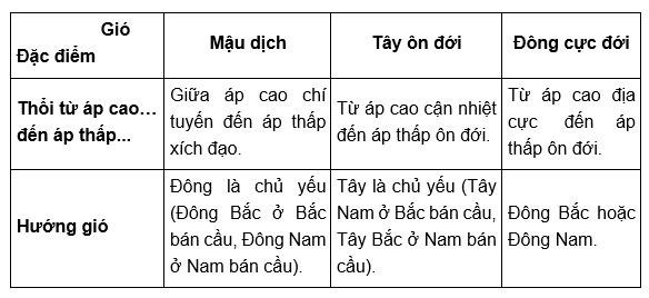 Dựa vào bảng các loại gió trên Trái Đất dưới đây để hoàn thành bài tập:
