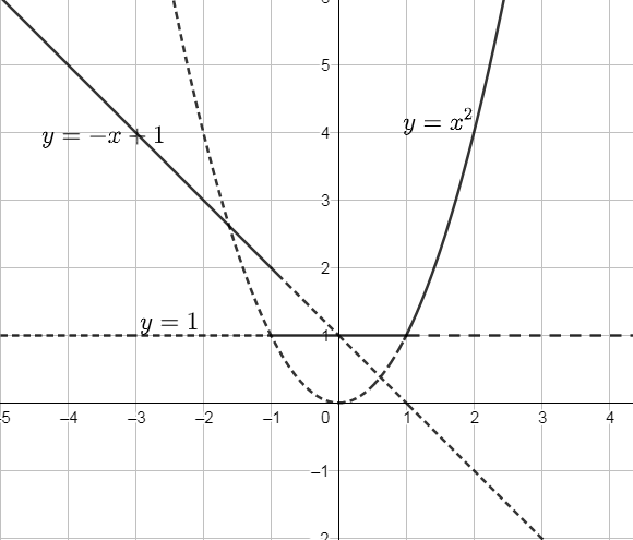 Vẽ đồ thị hàm số sau: \(f\left( x \right) = \left\{ \begin{array}{l} - x + 1{\rm{ khi }}x < - 1\\1{\rm{ khi }} - 1 \le x < 1{\rm{ }}\\{x^2}{\rm{ khi }}x \ge 1\end{array} \right.\)