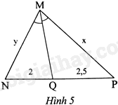 Trong Hình 5 có MQ là tia phân giác của \(\widehat {NMP}\). Tỉ số \(\frac{x}{y}\) là