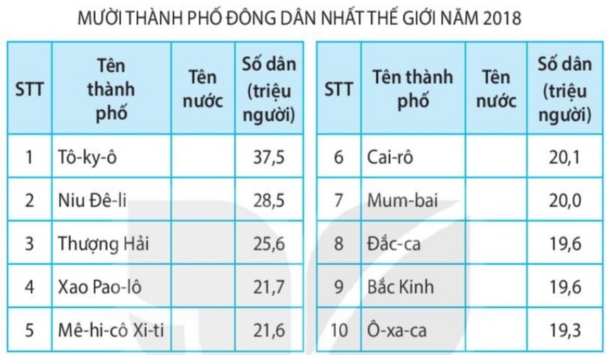 b) Tên năm thành phố đông dân nhất thế giới năm 2018