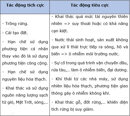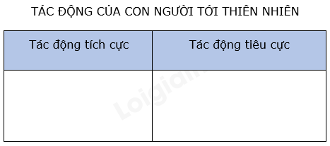 Hãy nêu năm tác động tích cực và năm tác động tiêu cực của con người đối với thiên nhiên theo mẫu sau.