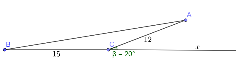 \(\begin{array}{l}A{B^2} = A{C^2} + B{C^2} - 2AC.BC.\cos C\\ \Rightarrow AB = \sqrt {A{C^2} + B{C^2} - 2AC.BC.\cos C} = \sqrt {{{12}^2} + {{15}^2} - 2.12.15.\cos 160^\circ } \simeq 26,6\end{array}\)