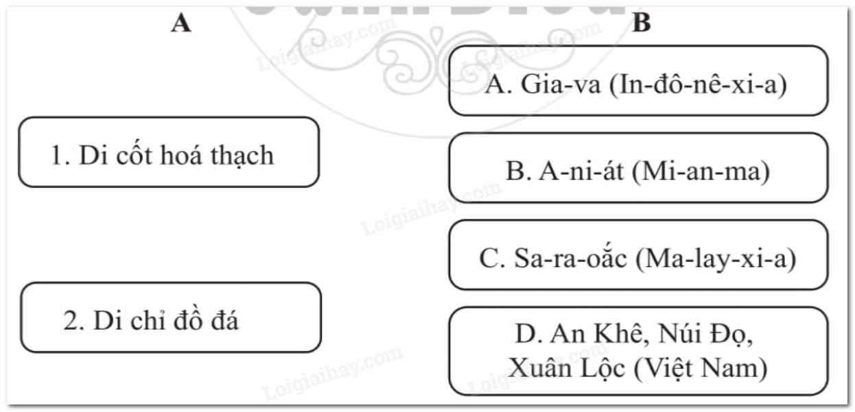 Hãy nối các dấu tích Người tối cổ ở Đông Nam Á ở cột A tương ứng với địa điểm tìm thấy ở cột B.