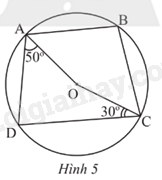 Cho tứ giác ABCD nội tiếp đường tròn (O). Biết \(\widehat {DAO}\) = 50o, \(\widehat {OCD}\) = 30o (Hình 5). Số đo của \(\widehat {ABC}\) là