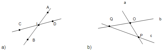 b) Hai đường thẳng a và b cắt nhau tại O, đường thẳng c cắt a tại P và cắt b tại Q.