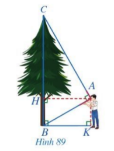 Trong Hình 89, bạn Minh dùng một dụng cụ để đo chiều cao của cây. Cho biết khoảng cách từ mắt bạn Minh đến cây và đến mặt đất lần lượt là \(AH = 2,8m\) và \(AK = 1,6m\). Em hãy tính chiều cao của cây.