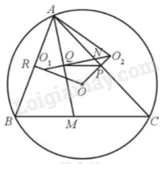 b) Gọi P, Q, R lần lượt là trung điểm của AC, AM, AB; N là giao điểm của QO2 và AC. Ta có \(\widehat {{\rm{O}}{{\rm{O}}_1}Q} = \widehat {RAQ} = \frac{{\widehat {BAC}}}{2}( = {180^o} - \widehat {R{O_1}Q})\) (1).