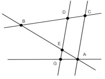 a) Tất cả các bộ ba điểm thẳng hàng: 3 điểm B,E, A; 3 điểm B, C, D và 3 điểm D, E G;