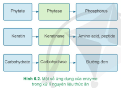 Luyện tập: Quan sát Hình 6.2, nêu một số loại enzyme được ứng dụng để xử lí các loại nguyên liệu thức ăn tương ứng
