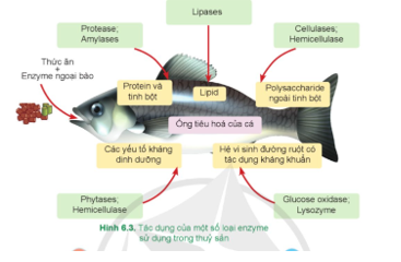 Luyện tập: Dựa vào Hình 6.3, nêu tác dụng của một số loại enzyme khi bổ sung vào thức ăn cho cá