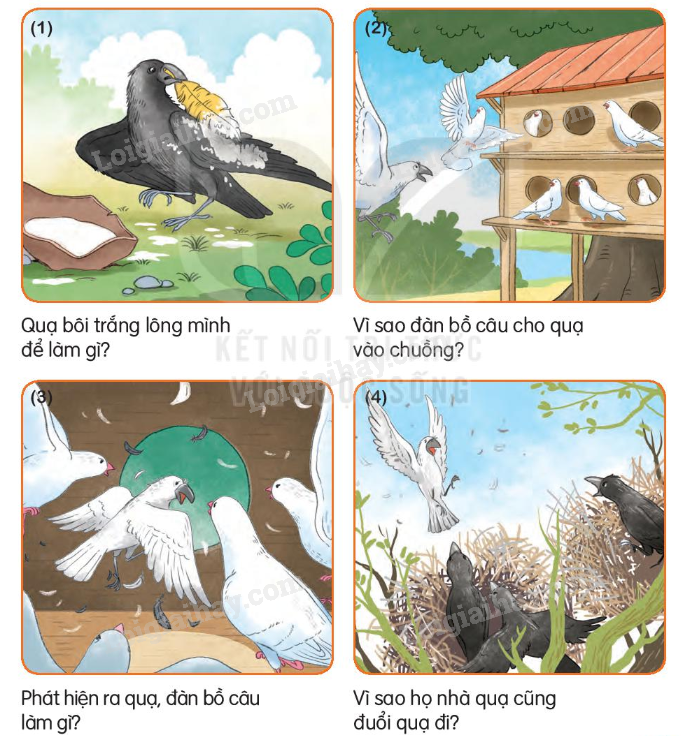 - Tranh 2: Đàn bồ câu cho quạ vào chuồng vì tưởng quạ cũng chính là bồ câu