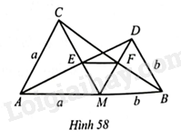 Cho điểm \(M\) thuộc đoạn thẳng \(AB\), với \(MA=a,MB=b\). Vẽ hai tam giác đều \(AMC\) và \(BMD\); gọi \(E\) là giao điểm của \(AD\) và \(CM\), \(F\) là giao điểm của \(DM\) và \(BC\) (Hình 58).