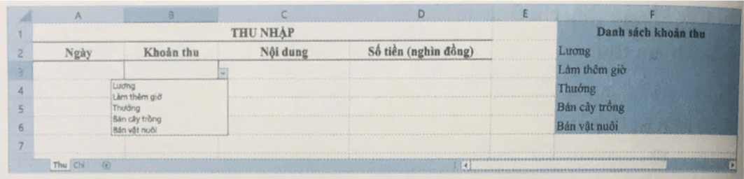 Danh sách mở ra khi nháy chuột vào nút bên phải ô tính B3 sẽ giống với danh sách đã cập nhật, cụ thể mục "Thường" được thay thế bằng "Lãi tiết kiệm". Bởi vì, sau khi thiết lập bằng nhập dữ liệu theo danh sách định sẵn, các mục trong danh sách mở ra tại ô tỉnh B3 luôn được tự động cập nhật từ Danh sách khoản thu tại khối ô tính F2:F6.