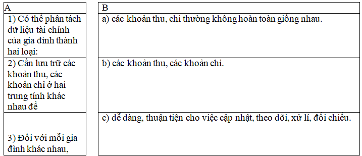 Điền các cụm từ (sắp xếp dữ liệu, lọc dữ liệu, vẽ biểu đó, thống kê, tổng hợp, so sánh, đối chiếu dữ liệu; cân đối thu, chi: ở dạng bảng; các khoản thu, chi) vào chỗ chấm cho phù hợp.