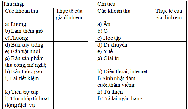Liệt kê các khoản thu, chi thực tế của gia đình em.