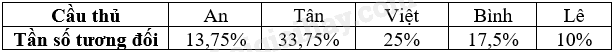 a) + Tính tần số tương đối ứng với các giá trị trong mẫu dữ liệu: Giá trị \({x_i}\) có tần số \({m_i}\) thì có tần số tương đối là: \({f_i} = \frac{{{m_i}}}{n}.100\left( \% \right)\) với m là tổng tất cả các tần số có trong mẫu số liệu.