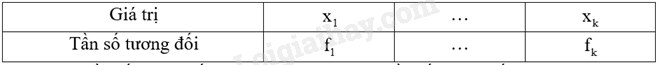 a) + Tính tần số tương đối ứng với các giá trị trong mẫu dữ liệu: Giá trị \({x_i}\) có tần số \({m_i}\) thì có tần số tương đối là: \({f_i} = \frac{{{m_i}}}{n}.100\left( \% \right)\) với m là tổng tất cả các tần số có trong mẫu số liệu.