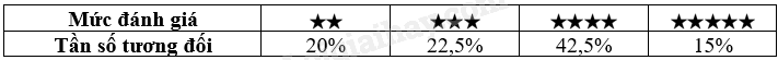 Tổng số đánh giá là: \(8 + 9 + 17 + 6 = 40\). Các tần số tương đối lần lượt vơi các mức từ 2 đến 5 là: