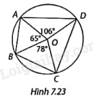 Ta có \(\widehat {ADC} = \frac{1}{2}\widehat {AOC} = \frac{1}{2}.\left( {{{65}^o} + {{78}^o}} \right) = 71,{5^o}\) (góc nội tiếp bằng nửa góc ở tâm cùng chắn cung AC)