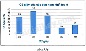 Biểu đồ cột Hình 7.16 cho biết cỡ giày của các bạn nam khối 9 trong trường.