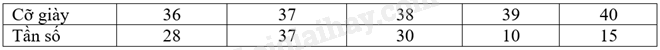 Cỡ giày 36, 37, 38, 39, 40 có tần số lần lượt là 28, 37, 30, 10, 15. Do đó, ta có bảng tần số: