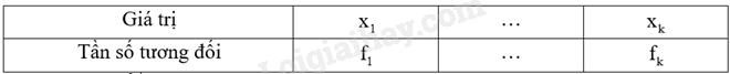 + Tính tần số tương đối ứng với các giá trị trong mẫu dữ liệu: Giá trị \({x_i}\) có tần số \({m_i}\) thì có tần số tương đối là: \({f_i} = \frac{{{m_i}}}{n}.100\left( \% \right)\) với m là tổng tất cả các tần số có trong mẫu số liệu.