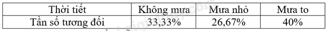 a) Tần số tương đối của số ngày không mưa, ngày mưa nhỏ và ngày mưa to lần lượt là: \(\frac{{10}}{{30}} \approx 33,33\% ;\frac{8}{{30}} \approx 26,67\% ;\frac{{12}}{{30}} = 40\% \)