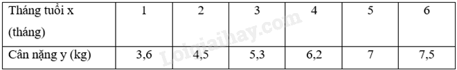 Mối quan hệ giữa số tháng tuổi x (tháng) và cân nặng y (kg) của một em bé trong 6 tháng đầu đời được cho bởi bảng sau:
