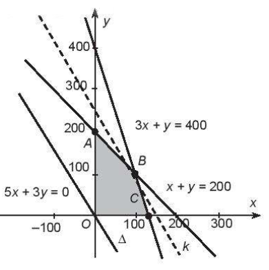 + Ta có: \(\left\{ \begin{array}{l}x + y \le 200\\15000x + 5000y \le 2000000\end{array} \right. \Rightarrow \left\{ \begin{array}{l}x + y \le 200\\3x + y \le 400\end{array} \right.\)