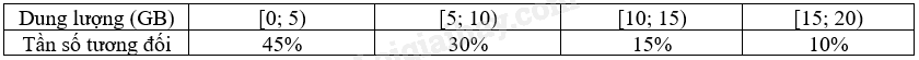 Một công ty quản lý phần mềm ứng dụng trực tuyến đã thống kê tỉ lệ người dùng phần mềm này theo dung lượng bộ nhớ dành cho lưu trữ ảnh và biểu diễn dưới dạng biểu đồ tần số tương đối ghép nhóm dạng cột như sau: