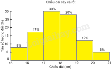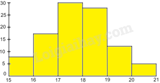 Do đó, tần số tương đối tương ứng với các nhóm \(\left[ {15;16} \right)\), \(\left[ {16;17} \right)\), \(\left[ {17;18} \right)\), \(\left[ {18;19} \right)\), \(\left[ {19;20} \right)\), \(\left[ {20;21} \right)\) là: \(\frac{8}{{100}} = 8\% ;\frac{{17}}{{100}} = 17\% ;\frac{{30}}{{100}} = 30\% ;\frac{{28}}{{100}} = 28\% ;\frac{{12}}{{100}} = 12\% ;\frac{5}{{100}} = 5\% \).