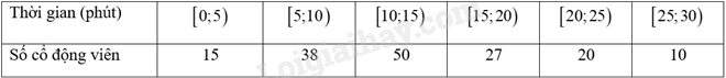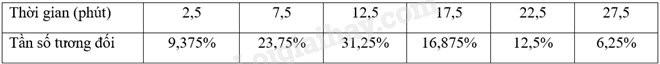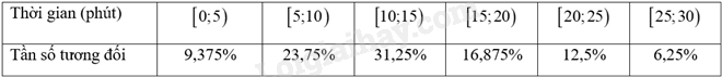 Tần số tương đối tương ứng với các nhóm số liệu thời gian \(\left[ {0;5} \right)\); \(\left[ {5;10} \right)\); \(\left[ {10;15} \right)\); \(\left[ {15;20} \right)\); \(\left[ {20;25} \right)\); \(\left[ {25;30} \right)\) là: