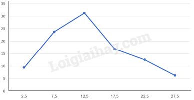 Bước 3: Với mỗi giá trị đại diện \({x_i}\) trên trục ngang và tần số tương đối \({f_i}\) tương ứng, ta xác định một điểm \({M_i}\left( {{x_i};{f_i}} \right)\). Nối các điểm liên tiếp với nhau.
